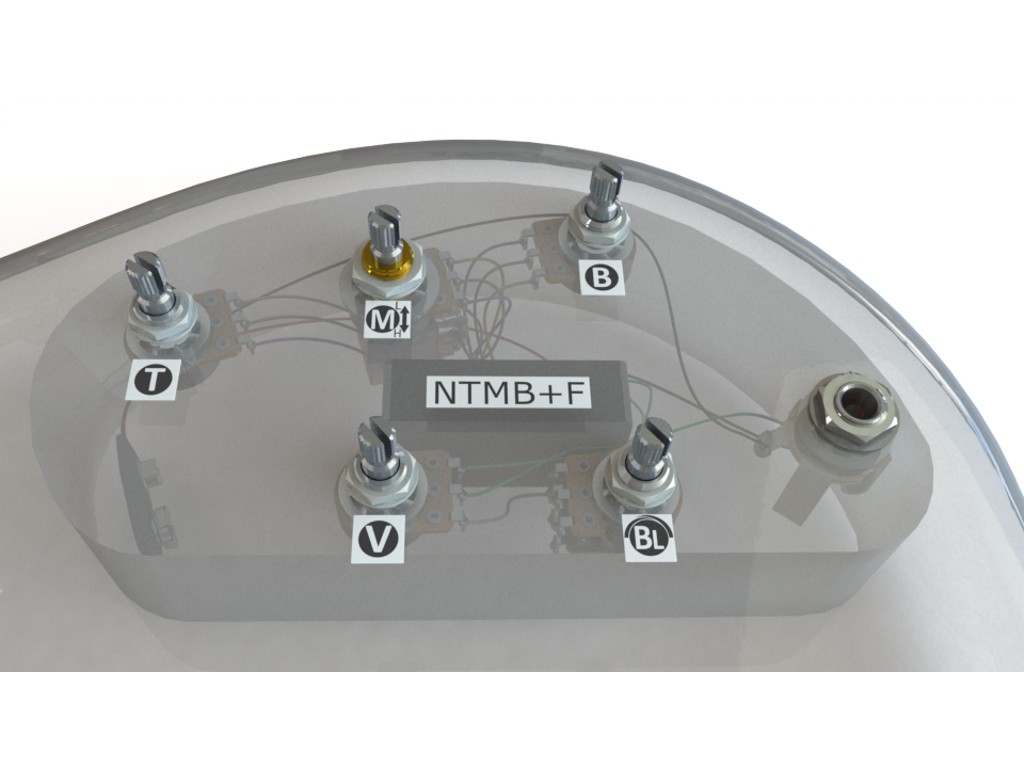 Our most popular preamp for decades, the NTMB+F is a 3-band tone control preamp with fully independent Bass, Mid and Treble controls. It is well known to professionals for its very low noise and wide boost and cut range for aggressive control. The voice is clear, transparent, and strong. The treble frequency is set high for maximum available brightness.