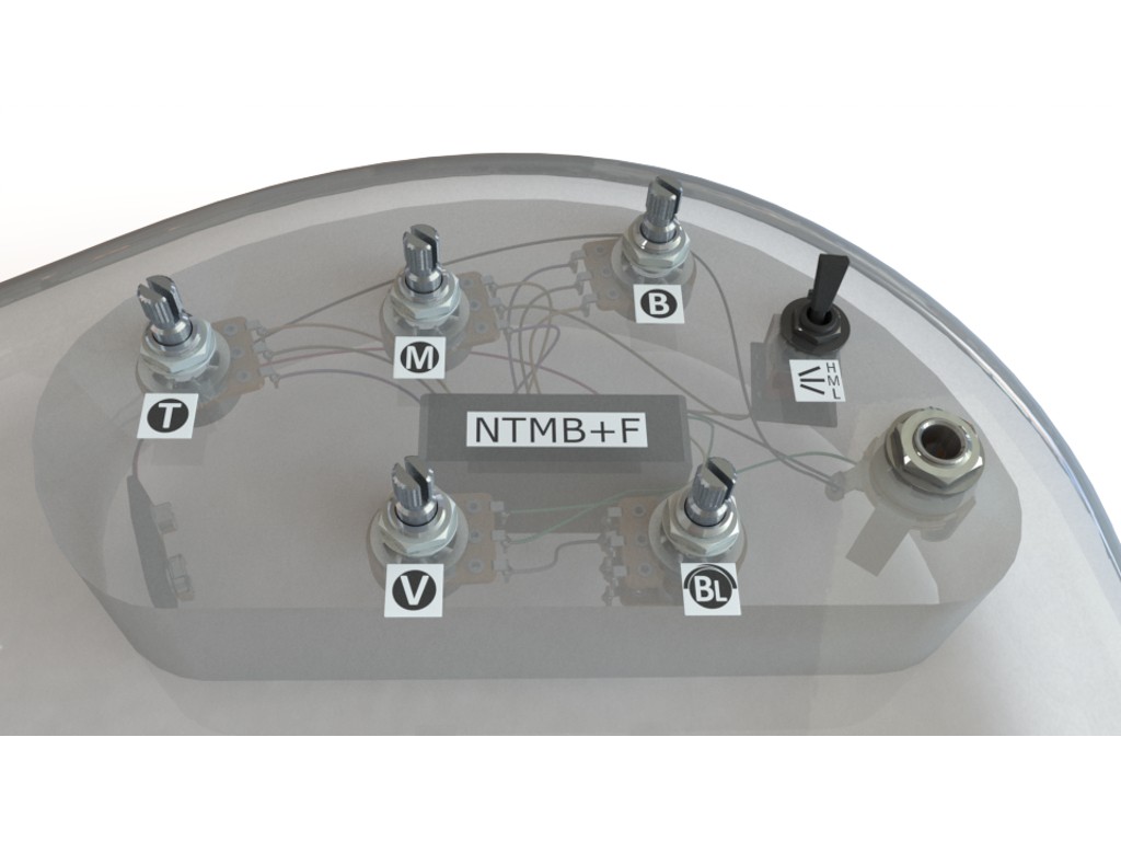 Our most popular preamp for decades, the NTMB+F is a 3-band tone control preamp with fully independent Bass, Mid and Treble controls. It is well known to professionals for its very low noise and wide boost and cut range for aggressive control. The voice is clear, transparent, and strong. The treble frequency is set high for maximum available brightness.