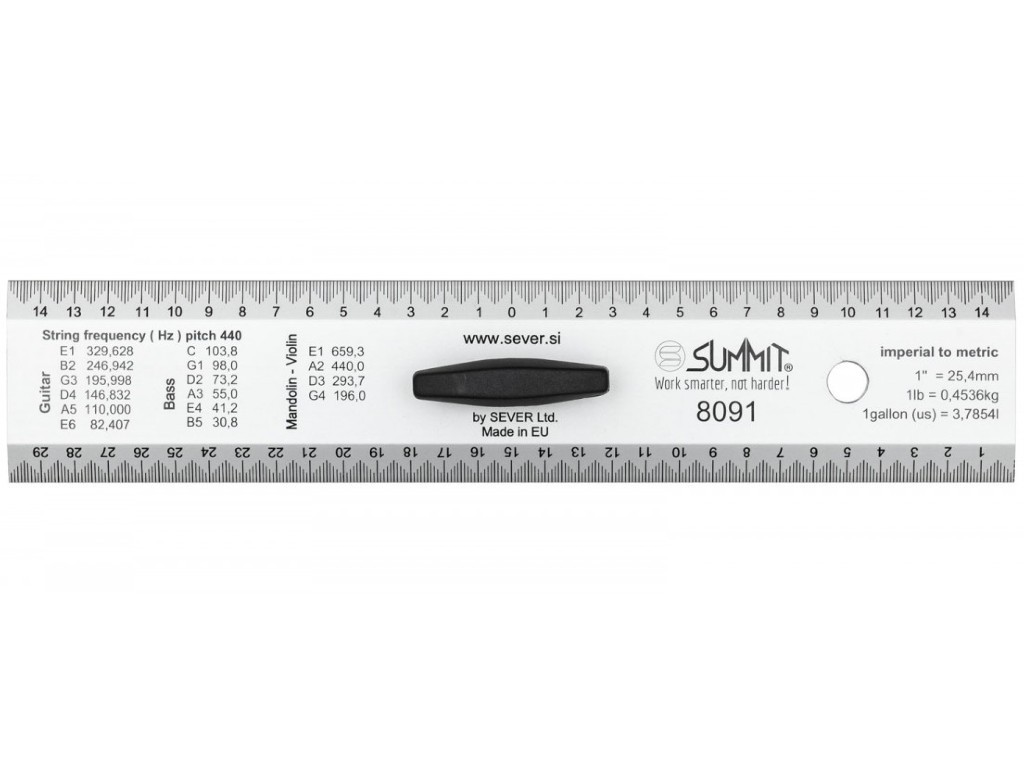 - Straightedge function  & ruler (with luthier helpful information) on the other side